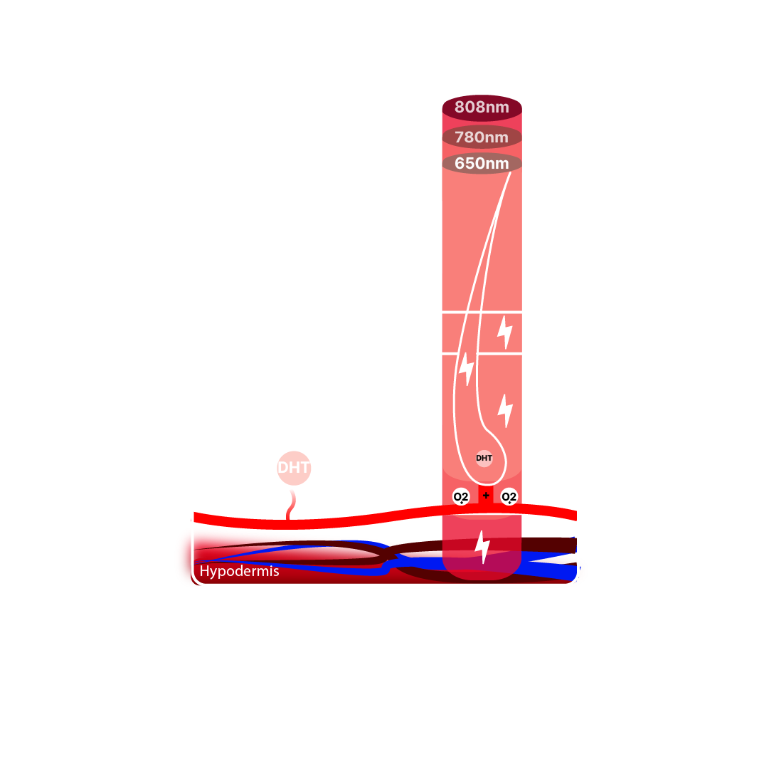 780nm and 808nm improve microcirculation and reduce deep inflammation — sustaining the scalp environment that allows growth to continue.