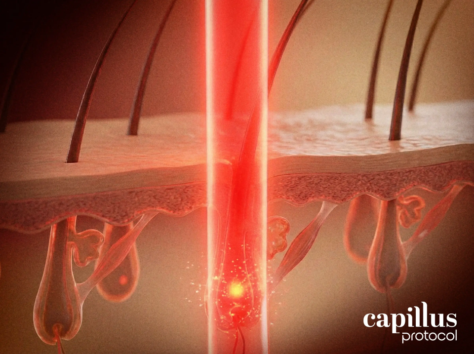 Low-level red light therapy works by delivering specific wavelengths of light to the scalp, where it is absorbed by cells involved in the hair growth cycle. This light energy supports cellular activity by interacting with the hair follicle environment, helping encourage follicles to remain in the growth (anagen) phase longer while supporting overall scalp conditions. Consistent exposure over time helps create an environment that is more conducive to hair growth by promoting healthier-looking hair and supporting normal follicle function as part of a regular wellness routine. Results depend on consistent use and individual factors such as hair and scalp condition.